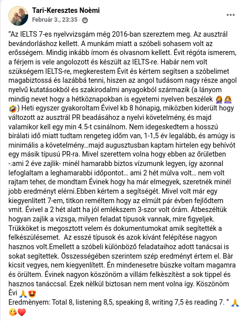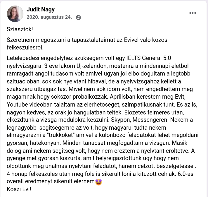 Letelepedesi engedelyhez szuksegem volt egy IELTS General 5.0 nyelvvizsgara. 3 eve lakom Uj-zelandon, mostanra a mindennapi eletbol ramragadt angol tudasom volt amivel ugyan jol elboldogultam a legtobb szituacioban, sok sok nyelvtani hibaval, de a nyelvvizsgahoz kellett a szakszeru utbaigazitas. Mivel nem sok idom volt, nem engedhettem meg magamnak hogy sokszor probalkozzak. Aprilisban kerestem meg Evit, Youtube videoban talaltam az elerhetoseget, szimpatikusnak tunt. Es az is, nagyon kedves, az orak jo hangulatban teltek. Elozetes felmeres utan, elkezdtunk a vizsga modulokra keszulni. Skypon, Messengeren. Nekem a legnagyobb segitsegemre az volt, hogy magyarul tudta nekem elmagyarazni a “trukkoket” amivel a kulonbozo feladatokat lehet megoldani gyorsan, hatekonyan. Minden tanacsat megfogadtam a vizsgan. Masik dolog ami nekem segitseg volt, hogy nem ereztem a nyelvtant eroltetve. A gyengeimet gyorsan kiszurta, amit helyreigazitottunk ugy hogy nem oldottunk meg unalmas nyelvtani feladatot, hanem celzott beszelgetessel.