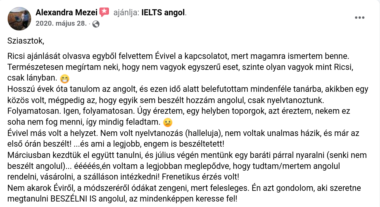 Nem akarok Éviről, a módszeréről ódákat zengeni, mert felesleges. Én azt gondolom, aki szeretne megtanulni BESZÉLNI IS angolul, az mindenképpen keresse fel!