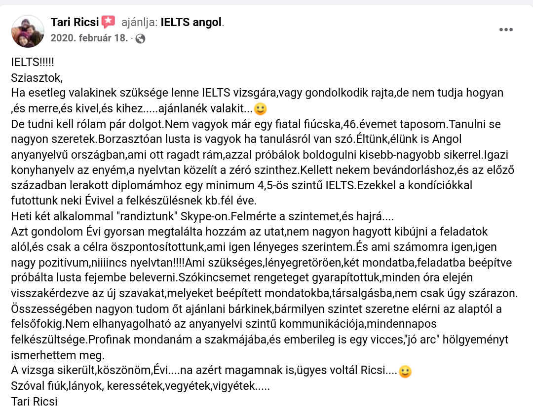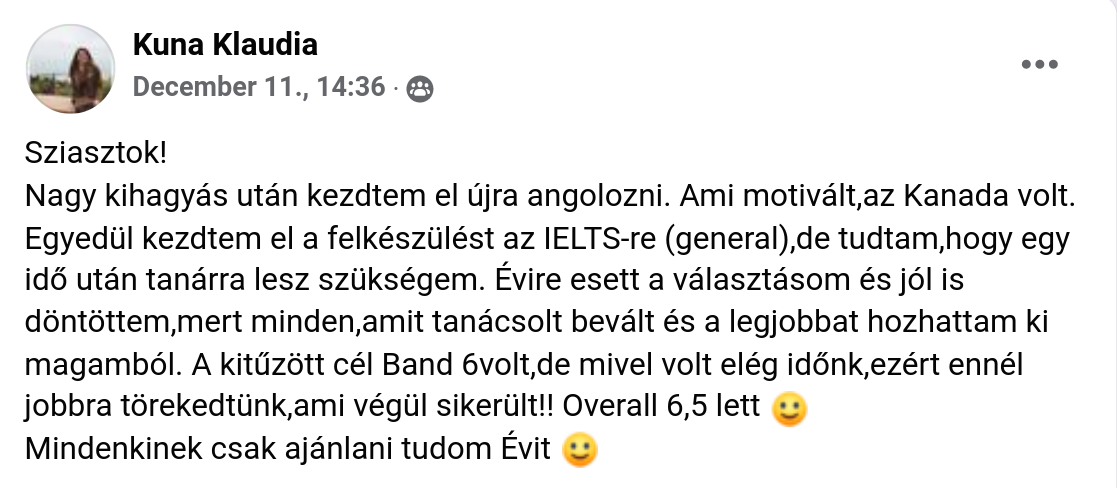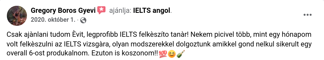 Csak ajànlani tudom Èvit, legprofibb IELTS felkèszíto tanàr! Nekem picivel több, mint egy hónapom volt felkèszulni az IELTS vizsgàra, olyan modszerekkel dolgoztunk amikkel gond nelkul sikerult egy overall 6-ost produkalnom. Ezuton is koszonom!!💯😊🍾