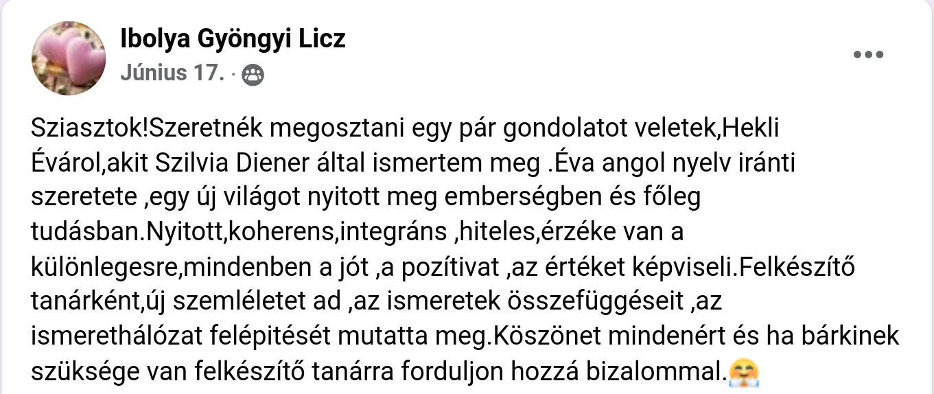 Sziasztok!Szeretnék megosztani egy pár gondolatot veletek,Hekli Évárol,akit Szilvia Diener által ismertem meg .Éva angol nyelv iránti szeretete ,egy új világot nyitott meg emberségben és főleg tudásban.Nyitott,koherens,integráns ,hiteles,érzéke van a különlegesre,mindenben a jót ,a pozítivat ,az értéket képviseli.Felkészítő tanárként,új szemléletet ad ,az ismeretek összefüggéseit ,az ismerethálózat felépitését mutatta meg.Köszönet mindenért és ha bárkinek szüksége van felkészítő tanárra forduljon hozzá bizalommal.🤗