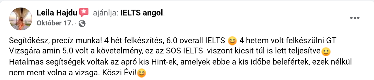 Segítőkész, precíz munka! 4 hét felkészítés, 6.0 overall IELTS 😊 4 hetem volt felkészülni GT Vizsgára amin 5.0 volt a követelmény, ez az SOS IELTS viszont kicsit túl is lett teljesítve🙂 Hatalmas segítségek voltak az apró kis Hint-ek, amelyek ebbe a kis időbe belefértek, ezek nélkül nem ment volna a vizsga. Köszi Évi!😊