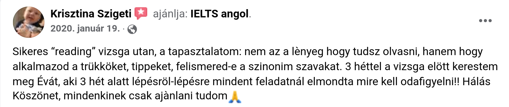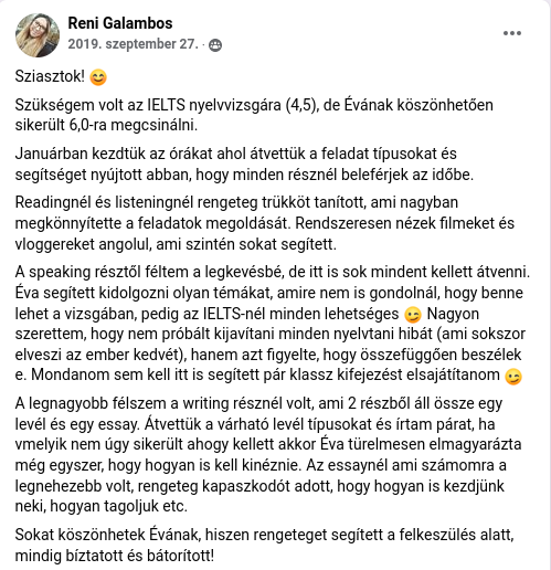 Sikeres “reading” vizsga utan, a tapasztalatom: nem az a lènyeg hogy tudsz olvasni, hanem hogy alkalmazod a trükköket, tippeket, felismered-e a szinonim szavakat. 3 héttel a vizsga elött kerestem meg Évát, aki 3 hét alatt lépésröl-lépésre mindent feladatnál elmondta mire kell odafigyelni!! Hálás Köszönet, mindenkinek csak ajànlani tudom🙏2020.01.19.